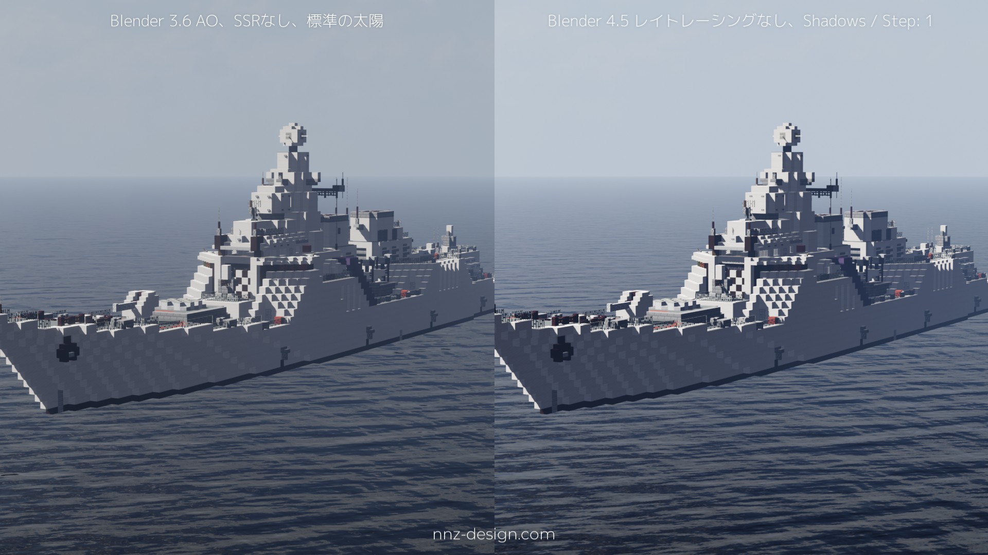 Render Properties > Sampling > Shadows > Steps: 1と設定すると、こちら。