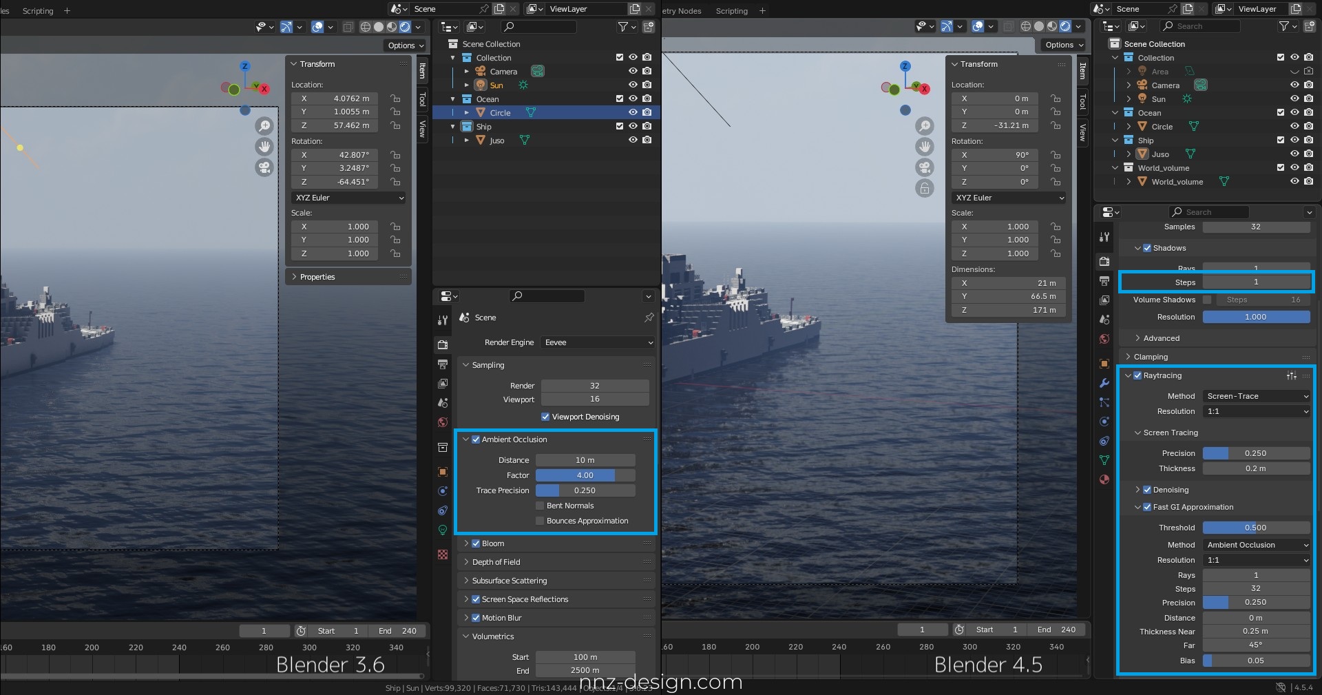 参考として、3.6でAOをオフにしたものと、4.5でレイトレーシングをオフにしたものを比較しました。