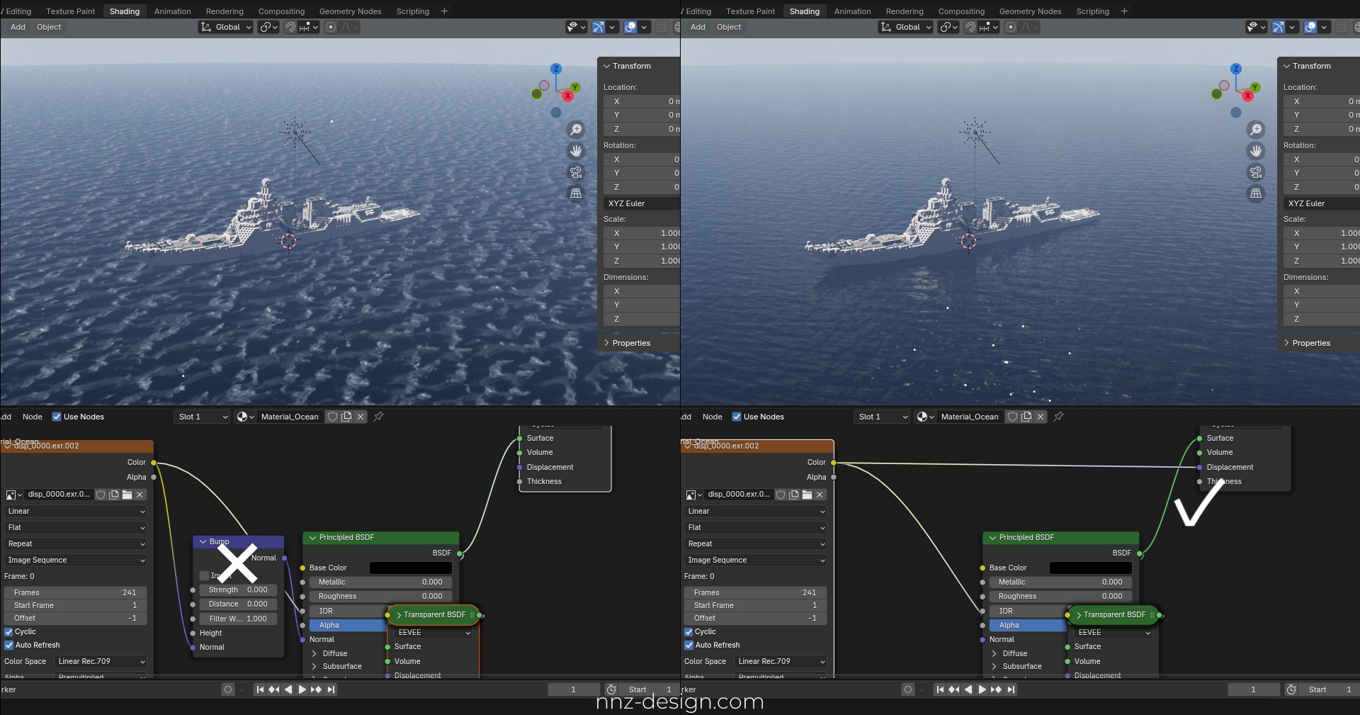 以前のバージョンでは、海洋モディファイアで出力したexr画像をBumpノードを介してNromalに読み込ませることができましたが、Blender 4 以降は、Displacenemntとして読み込ませる必要があります。