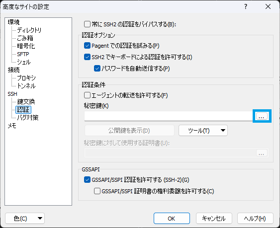 設定をクリックし、 SSH > 認証 > 認証条件 > 秘密鍵 の右の…をクリックし、先ほど生成したppkを選択。OKで戻る。