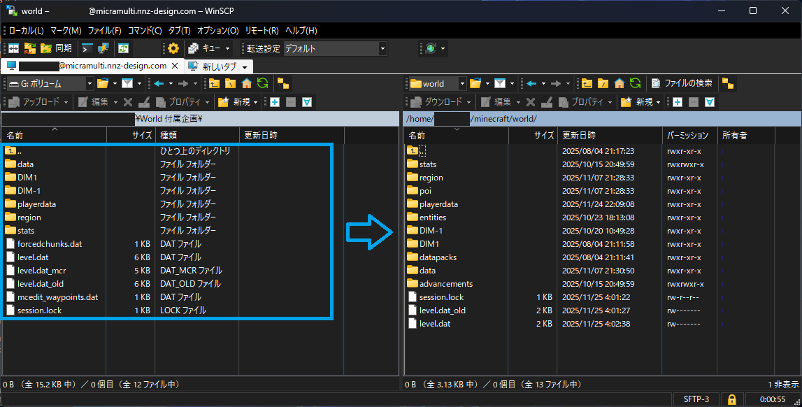 SSHでの接続や、今回のSFTPで接続するユーザーがマイクラサーバーのworldディレクトリをwriteする権限を持っている必要があります。