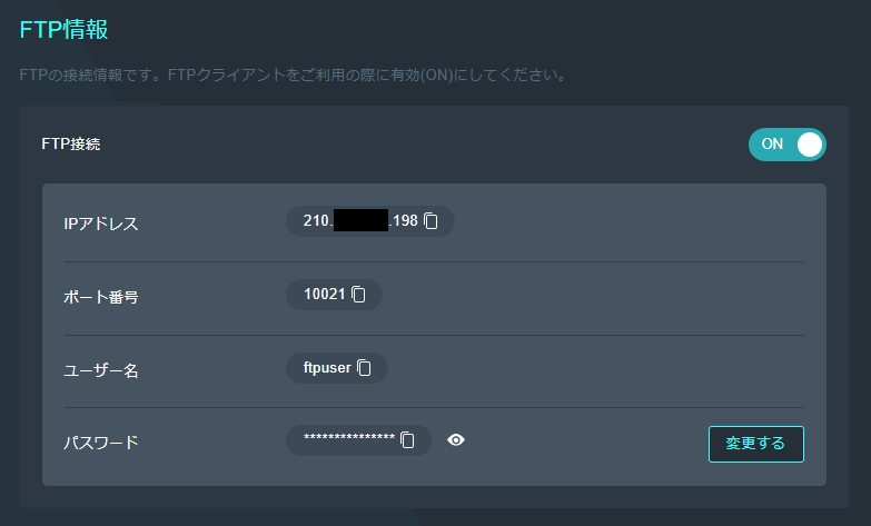多くのレンタルサーバーでは、ワールドのアップロードのためにFTP接続用のIP、ユーザー名、パスワードが用意されているはずですので、それを探してください。 もし、その近くに「接続を開始」などボタンがある場合は押しておいてください。セキュリティのため時間制限があるかもしれません。
